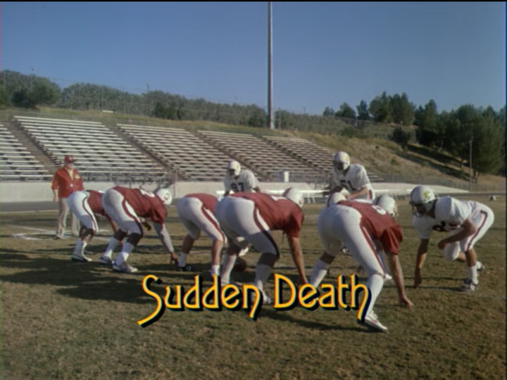 The next morning Jessica talks with Tank on the field at the stadium. I find it amusing to note that there are only eleven people total on the field, including Tank, who is stretching off to the side. This is just the wrong scale for a football team. I understand that actors cost money, but would it have been that expensive to have two dozen extras in football-looking clothes off on the other end of the field?