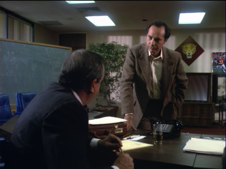 I think part of my problem is that most of the characters didn’t land for me. I think that Jill was supposed to be a major center of sympathy within the episode but about the sum total of her personality was being deaf. I think this was more special at the time because it was extremely rare to have deaf people on TV—and it probably still is—but 1980s virtue signaling isn’t more interesting than 2020s virtue signaling. Any emotional resonance which Zak and his wife have are derived from being Jill’s parents, and we find out that they might be her parents by having illegal bought her because they were impatient, which isn’t a great basis for sympathy. Tank and Grover Dillon are the only other two major characters. Tank is likable, but mostly untouched by anything that happens in the episode. Grover is also likable, but a bit under-used and not much more affected than Tank. Oh, and there’s coach Padillo. He’s not very likable and for some reason was never much of a suspect. Truth to tell, I found him a bit forgettable. Oh, there was also Talmadge, the commissioner. He simply made no sense, since he was treated like a suspect but couldn’t have been. And Jessica had an antipathy to him which made no sense, especially given her general love for authority figures. And I suppose that there was Lt. Pace, but he was almost a comic relief character.
