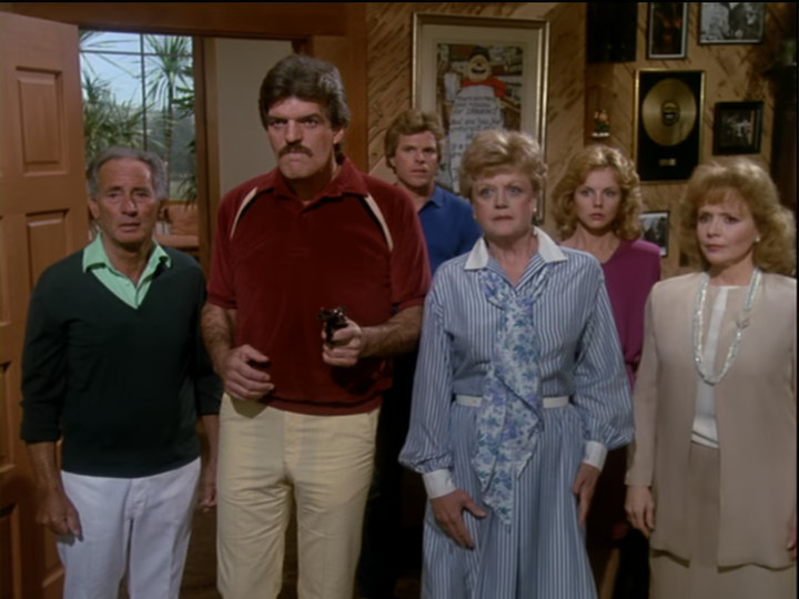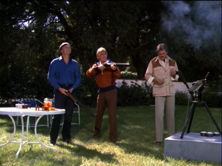 Murder, She Wrote absolutely loved trap shooting as a rich man’s activity. In real life it requires many acres of land to be able to safely fire shotguns into the air. On a TV set, where blanks will do just fine for the actors and you don’t need to actually load the clay pigeon thrower because the camera won’t capture the clay pigeon anyway, it’s far less demanding and the requirements for props are quite modest.