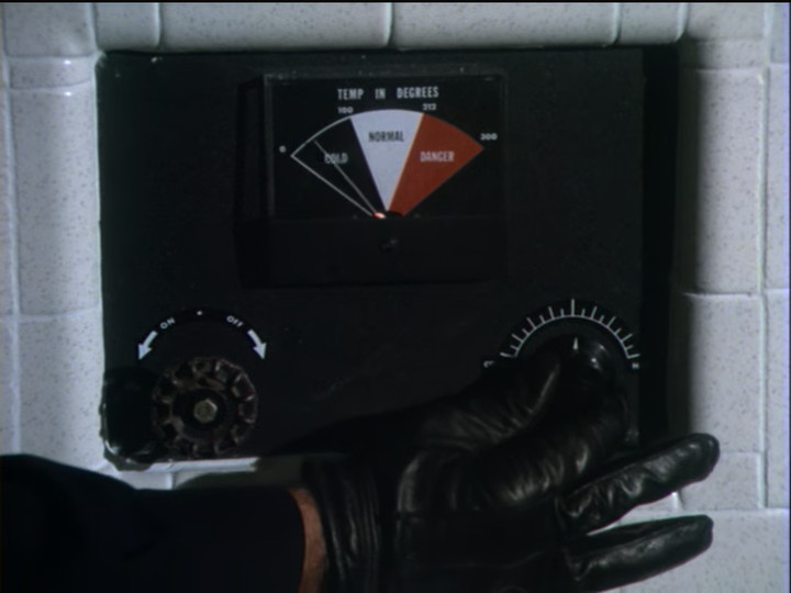 I really love this control, including its placement outside the steam room for convenient access for murderers. The figure in black turns the nob on the lower right, which immediately moves the needle on the temperature gauge. The figure turns it all the way, so that the needle on the temperature gauges maxes out the danger setting. I can’t make out the label on point between normal and danger, but looking closely the separation between normal and cold seems to be 120 and the top end of danger is 200. I wonder what the guy who designed the steam room thought the value of having a danger zone as large as the normal zone was. (A large danger zone would make sense if this were just a temperature gauge, but it’s a thermostat control—it moves synchronously with the nob the figure in black turns and before steam starts coming out of the vents.)