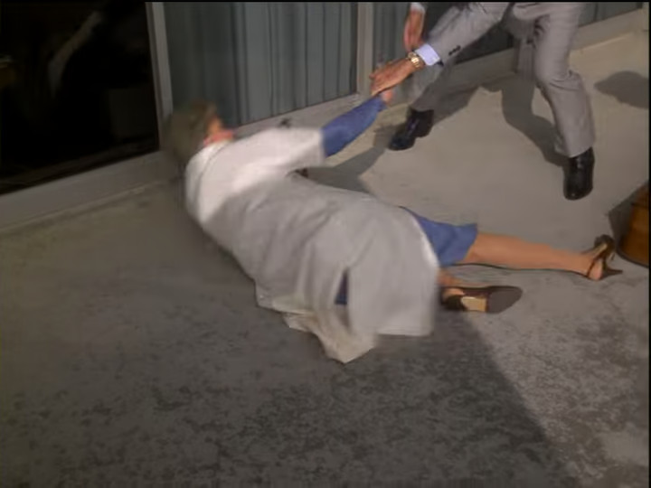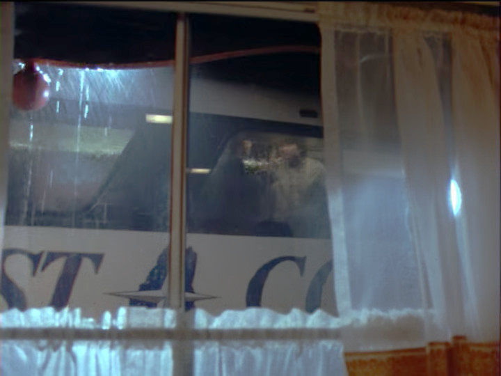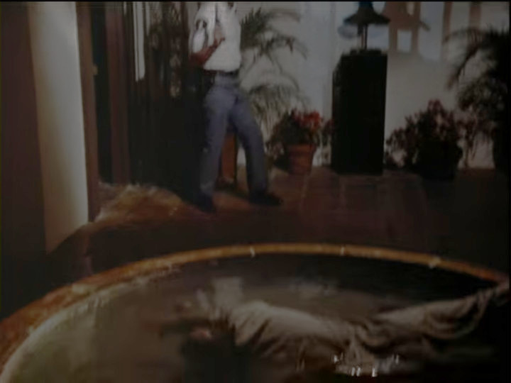 Back at her hotel, at night, Jessica is on the phone with Amos. (This is a neat device to help connect Jessica to Cabot Cove without having to set anything there or even have Tom Bosley in the episode.) She then hears that the bathtub is almost full and says goodbye to him to run and turn the water off before it overflows. While bending over the tub to reach the handles, she notices something: