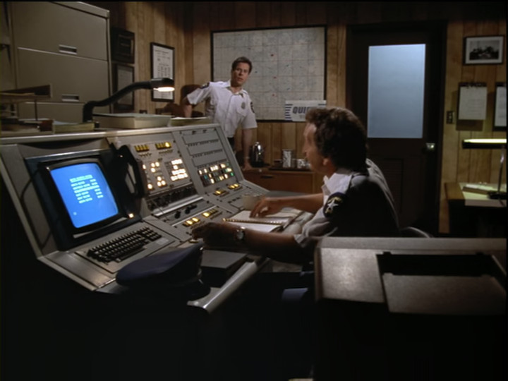 The scene then shifts to the police station. I always love Murder, She Wrote‘s establishing shots, and this is no exception: