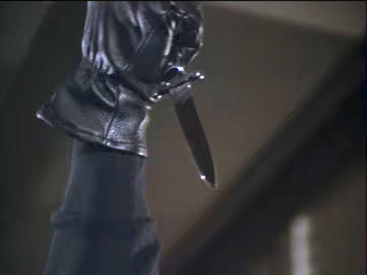 Jessica then goes and investigates Kreuger’s house. The front door is ajar and no one answers to Jessica’s calls, so she enters and walks upstairs to investigate the master bathroom. There she discovers that the floor is wet next to the bathtub. Then the camera pans up we see the shadow of someone holding a gun by the open door…