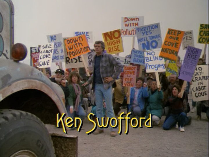 Harry goes over and talks to David. We establish that Harry thinks that this will be great for Cabot Cove because of all of the tourists it will bring in, though not why on earth he thinks that a twenty story luxury hotel will bring tourists in. Hotels are not usually destinations in themselves and Cabot Cove hardly seems like the kind of place to bring in more guests then residents given how little there is to do here.