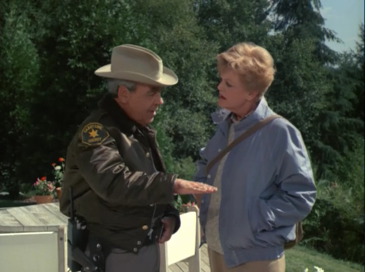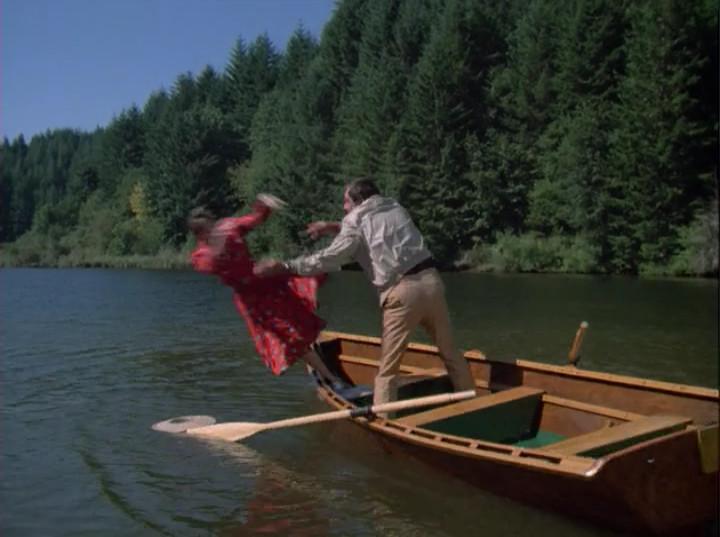 Jessica points out that it’s implausible that a non-swimmer would try to kill a champion swimmer by drowning her in a lake. It occurs to Jessica that another explanation would be that Carolyn had made the thing up, to pretend that her husband tried to kill her in order to get a big divorce settlement. This tête-a-tête is broken up by the discovery of Carolyn’s body. It was on the north side of the lake, which apparently is pretty far away from where the resort is (they never say that they’re on the south side of the lake, nor how big the lake is). Sheriff Tupper says that this blows Jessica’s theory out of the water and clearly Howard killed as Tupper had been saying all along. Jessica asks him how the body got to the other side of the lake so quickly, to which Sheriff Tupper has no answer.