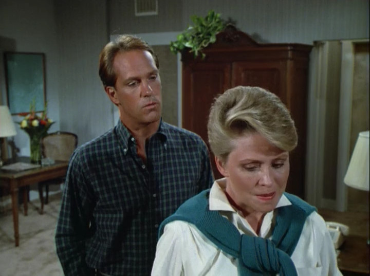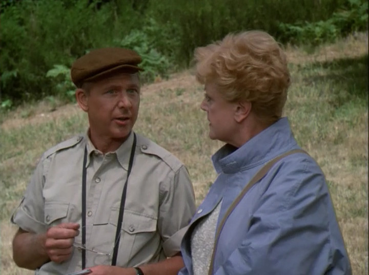 Jessica goes off for a writing retreat at a lakeside resort near Cabot cove. There she meets an assortment of guests—a wealthy, older, overbearing husband (Howard Crane) and put-upon younger wife (Carolyn Crane), an older man who is devoted to bird watching (Burton), a young woman who loves to run naked in the forest (Joanna), and a younger husband and wife where the husband (Kyle Jordan) likes to go fishing and the wife (Betty Jordan) likes to fool around with the boat house manager (Jack Turney) while her husband goes fishing. Not entirely surprisingly, at least given how much screen time the overbearing husband gets, while on a morning bird-watching walk that Burton invited her to, Jessica sees Howard and Carolyn in a boat, wrestling with each other. She calls out, but the wrestling continues then Carolyn goes into the water.