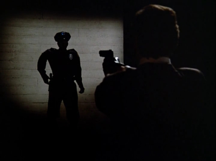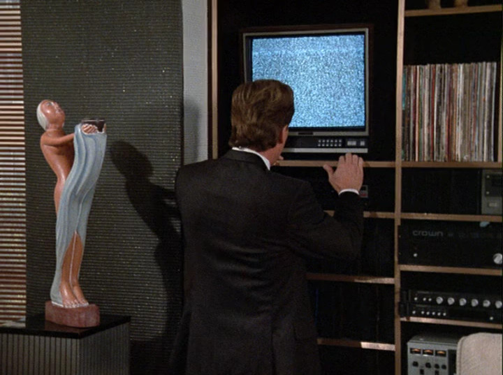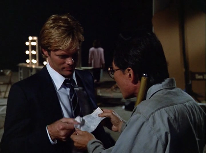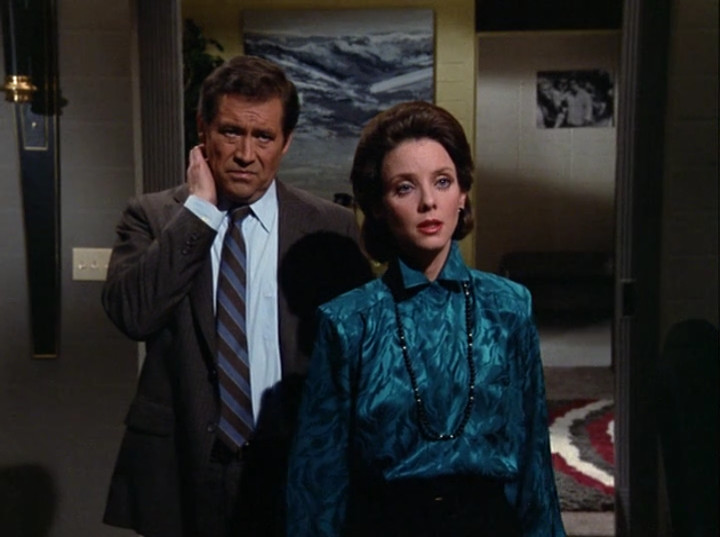 I think that what really makes the episode so memorable is that it has so many talented actors playing well defined—if not always sensible—characters. Adrienne Barbeau’s tough, ambitious producer leaps off the screen, even if she is barely related to the plot. Barry Corbin’s Lieutenant Flanagan is, despite his foibles, deeply likable. Judith Chapman’s Jayne makes you feel all of the trouble and pain her character is going through; one believes that she was a magnificent psychiatrist before she gave it up. She is plausible as a woman worth killing for. George Takei’s janitor was a fascinating character. He’s almost like a happy grouch, with a completely unrelatable love of garbage. One might almost want to see his collection of immortalized trash. Even Pat Klous’s blond assistant was a vivid character—so innocent, fragile, and trusting. That makes no sense for a woman who was romantically involved with a man like Chambers, not to mention being both his secretary and an on-air co-host makes absolutely zero sense. Still, she was a vulnerable almost-child, and you felt that. And then there’s Morgan Steven’s Robert Warren. He is plausible as a charming psychopath, especially the charming part.
