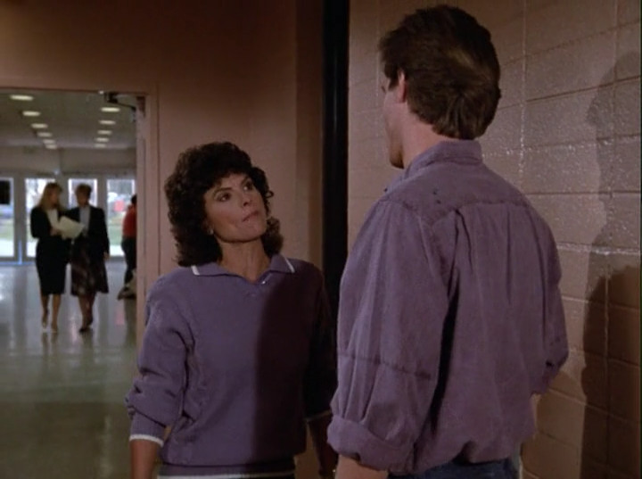 Chad’s friend at the paper has his own desk, and it’s only one of several. The room itself is quite large, what you see in the image above is only one corner of it. It’s only a slightly scaled-down version of the sort of set Murder, She Wrote would use for a full-blown newspaper. Chad asks to read through their files to dig up old information, and the mustache guy makes giving him an exclusive interview about Michael a condition. Why the school newspaper has secret files that only some students have access to, we are never told. In fact, I’m unclear on why the mustache guy is a character at all. (He’s the guy in the earlier scene about the protest and it possibly being because of an editorial he wrote in the school newspaper.) The idea that the school newspaper has such a huge effect strikes me as a bit silly. Granted, I went to college about 10 years after this episode was written and in a small school rather than a large state school, but I can’t even remember clearly if we had a school newspaper. I do remember we had a student-run radio station that more people DJ’d for than listened to and a student-run local TV show that I never heard of anyone watching. I assume that we had a school newspaper. Looking it up, it turns out that we did. I can’t remember ever seeing anyone read it and I have a lot of trouble believing that anyone could stir up trouble with an editorial in it. (Also, looking it up, it seems like the school newspaper came out about once a month, not daily, as the newspaper in this story seems to.) Why it is that TV shows in the 1980s (and 1990s) took newspapers of all kinds to be enormously important affairs, I’m really not sure. Wishful thinking, perhaps?