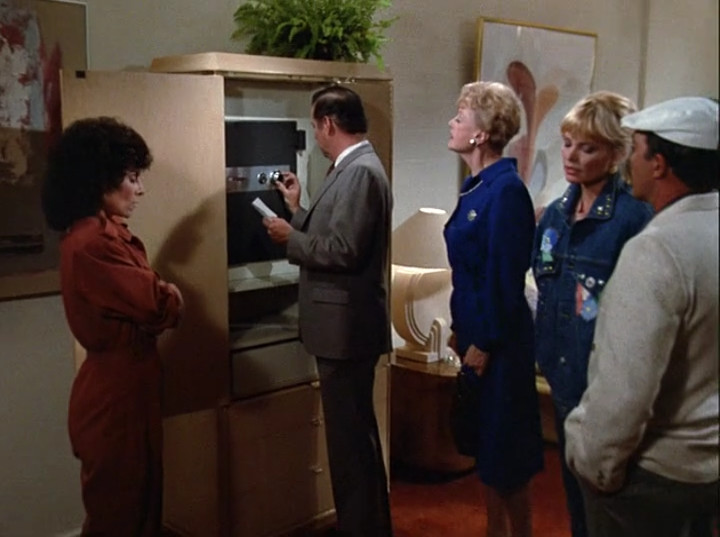 It’s also curious that this makes very explicit the murder-mystery-as-game. That’s not everyone’s idea of what a murder mystery should be, and it’s only somewhat an aspect of Murder, She Wrote. It is, I maintain, why Jessica typically solves murders by inspiration, often from some innocuous phrase that someone says—that’s to give people time to solve the mystery themselves after all of the clues necessary to do it are in. If Jessica solved it immediately, there’d be no time (or at least very little time) for people to guess. Worse, it would drive home what the clinching clue was. By delaying Jessica coming to the conclusion, it both avoids highlighting the clinching clue and also gives the audience time to guess or even to discuss with the other people watching who each person thinks did it. Here, that time is provided by Jessica asking who did it. It’s weird—which may be why they never did it again—but it does kind of work.