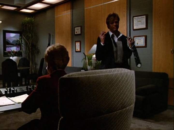 I also have to say that I found the set decoration very interesting in both Steve and Kenneth’s office. (It was pretty clearly actually the same set just redecorated, with the TV/sound equipment on the back wall not even being different.) The cavernous office was so large it had quite a lot of furniture in it, so there was plenty to look at. Wall sconces, art on pedestals, five varieties of things to sit on, statues, paintings—there was a ton of visual interest. It was just an interesting place to watch a murder mystery.