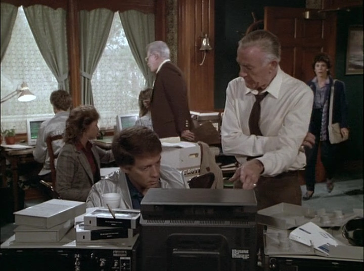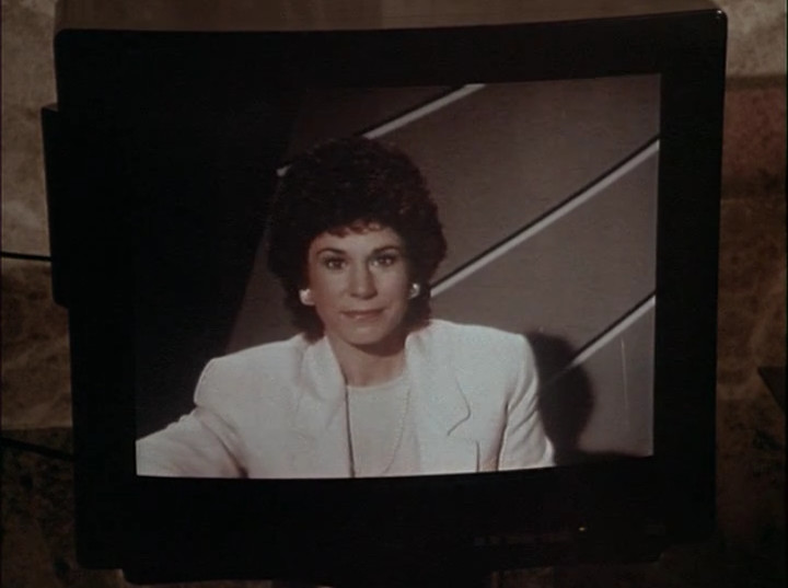 The faux news show in this episode, coming, as it did, in 1986, is in an interesting time. Older people still regarded the news with obsequious gullibility, but children (I was not yet ten) did not, and even in this show one can see a certain amount of cynical realism about the news starting to creep in even to the way it’s presented here in Murder, She Wrote. News was, by this time, a business. Nick, the old man of the three, represents the old time, respected news. Confidential audience research suggests that audiences don’t like him nearly as much as his two younger, better-looking co-stars.