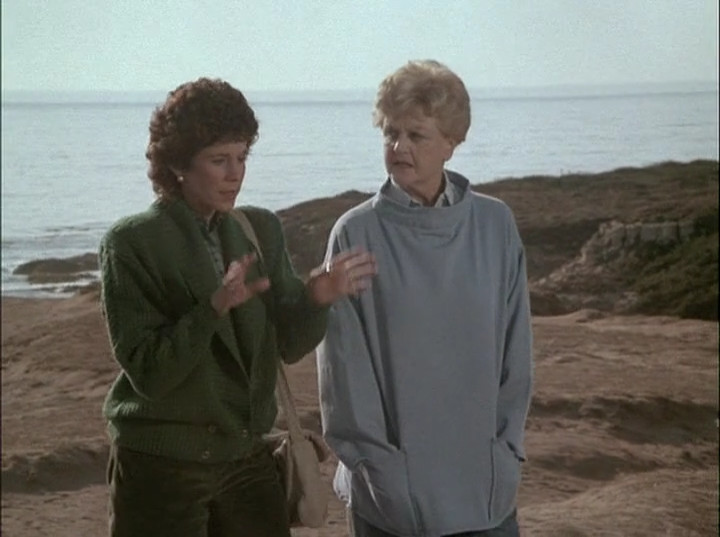I’m very unclear on why this scene exists; all it serves to do is to remove the mystery about what happened to Kevin Keats only a few seconds after the mystery was raised. In that way it’s reminiscent of the scene in which the bald enforcer calls his art collector boss and tells him that he didn’t have to kill Keats after all. Is this meant to be a help to the audience? Does Murder, She Wrote have a maximum amount of mystery it’s supposed to maintain in order to not be too confusing to the viewer? I don’t know if that’s the case but it’s an interesting thought. This is television, probably at its height in terms of numbers of viewers of an episode—at that time when an enormous number of people were watching but there were not, yet, hundreds of TV channels competing for viewers. According to Wikipedia, at its height Murder, She Wrote had about forty million viewers, and even in its eleventh season it had about fifteen million viewers per episode. Perhaps in order to be most comfortable to a general audience they wanted to keep the number of things the audience had to keep track of to a minimum.