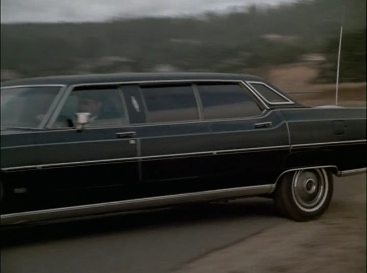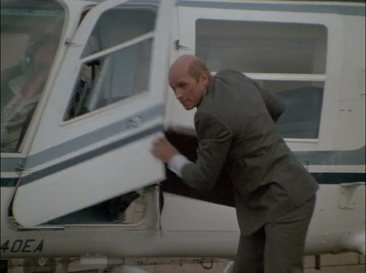 We then cut to Amos Tupper, in an ugly brown suit which he apparently bought just for the occasion, driving along the coast road. (I’ve got a screenshot of the ugly brown suit later on.) He pulls over when he sees a helicopter descending towards a stretch limo. The helicopter lands…