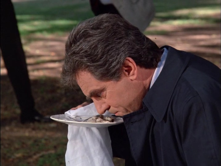 As the detective inspector investigating the case is smelling the pickled herring, the doctor muses that it’s surprising that the Viscount died of a heart attack when he was looking so good just this morning. “A heart attack? That’s what you think, doctor?” the DI asks incredulously. He orders an autopsy. The doctor, who still thinks that a man who ceased to need a wheelchair when he cheered up a bit was actually dying, protests that it’s outrageous to think that his diagnosis of a heart attack is in any way questionable. The detective is unmoved by the doctor’s protests and orders the autopsy anyway.