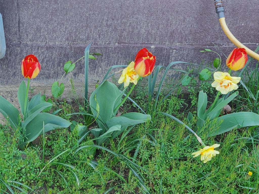 Back in the fall, as the weather was getting cold and plants were dying off I bought some flower bulbs and planted them in a newly open spot by my house. This spring, they’ve bloomed, justifying the effort involved. (Already done are some crocus, in the foreground, and not yet done is some weeding.)