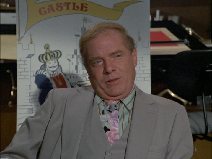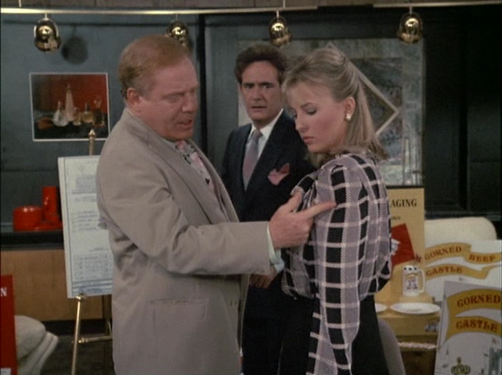 The episode opens in Kinkaid advertising, where Larry Kinkaid and Jessica’s niece, Victoria Griffin, are giving a presentation to Grover Barth, owner of a large corned beef sandwich fast food franchise. I’ve got to say that I think that this is a really brilliant send-up of fast food places. Various fast food places get known for a certain kind of sandwich, but they’re not (usually) named for it, as if it’s the only thing they serve. Further, corned beef is a niche food, which makes it a funny thing to base a country-wide fast food empire on. Here’s Grover, owner of Corned Beef Castle: