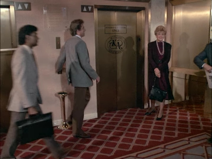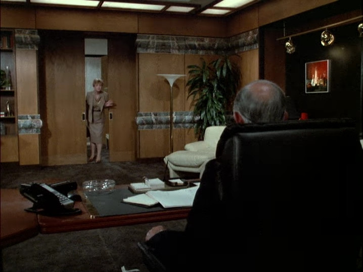 I can’t help but notice, again, how cavernous this office is. I suspect it’s the same basic set that was used as both offices in The Bottom Line is Murder, though decorated differently. That also had the strange ante-chamber to the office. It’s possible that it’s so large in order to suggest high-flying luxury, though possibly it’s really just to make it easy to fit all of the camera equipment in the room (it looks like it possible does in fact have four walls). The ante-chamber is especially curious. It served no purpose whatever in The Bottom Line Is Murder, but here is the location of the secretary’s desk. The only time I can remember her being there is when Christine went back to get her purse; every other time anyone went by they tended to mention that the secretary was away from her desk.