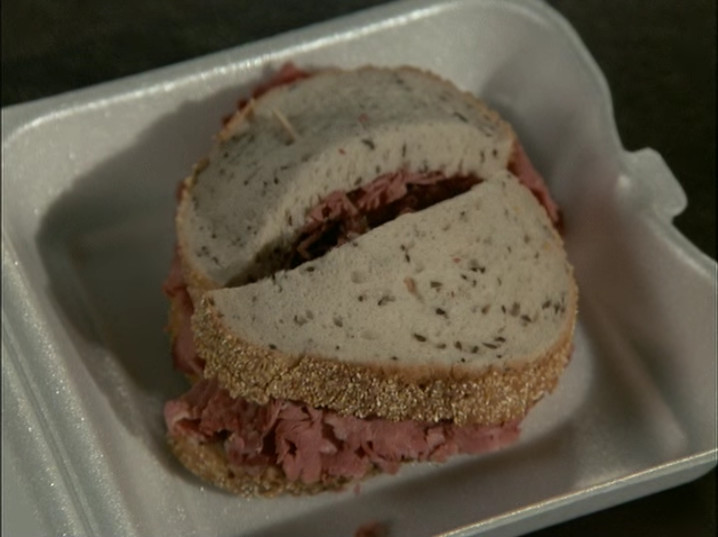 That only leaves us with Aubrey Thornton. He had motive and until moments before it’s revealed that he is the murderer, so far as we knew he didn’t have an alibi. The only thing that really mitigated against him was his forgetability. That, plus even apart from how he achieved his leaky alibi, intercepting a corned beef sandwich order would require somewhat implausible timing given that he had no way of knowing when the order was placed. The murder being implausible is not the best way to shield the murderer from suspicion.