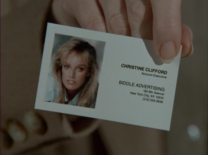 As a side note, I don’t know if they actually used the actress’s head shot for the card or took their own picture, but it really looks like they just used one of her head shots. One convenient thing about actors is that they all have head shots that can be used whenever a photo of them is required. The security guard is surprised that the card says Christine Clifford, and supposes that Mary Jones is her professional name. A towering intellect, that one. Jessica condescendingly agrees, saying, “like a stage name.”