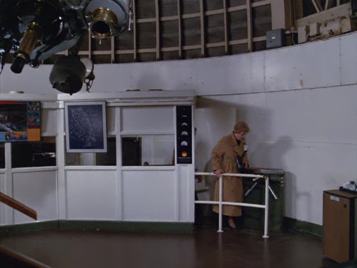 I really love the blinkenlights panels on the side. It’s hard to imagine what they’re supposed to represent (especially with no massive computer behind them), but they really brighten the place up. I suspect that this is an actual observatory which has been set-dressed to look more sciency, but you never do know. A lot of science equipment in universities is one-off stuff that lasts a surprisingly long time.