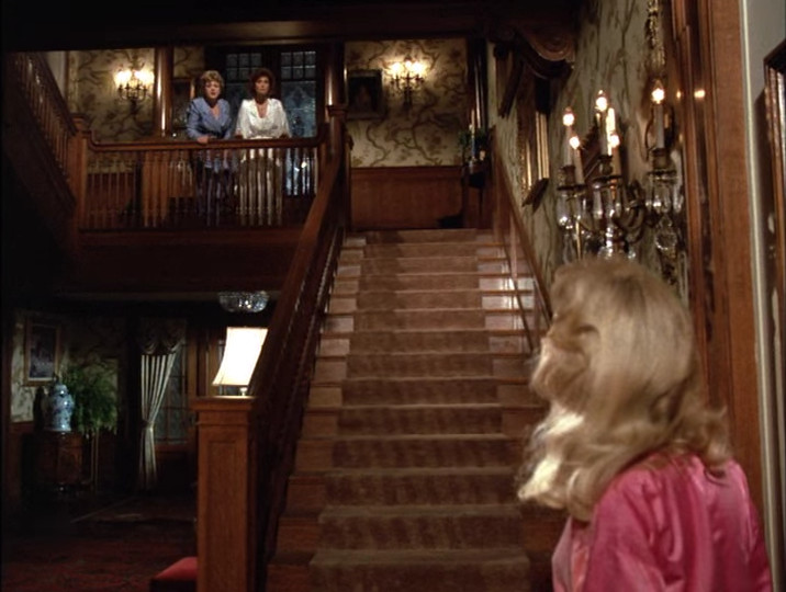 A few hours later we see Alice in a nightgown coming down the stairs and looking for Richard. She seems to believe that he’s in the study. She knocks increasingly loudly and calls to him, but the door is locked. This brings Jessica and Caroline to the top of the stairs.