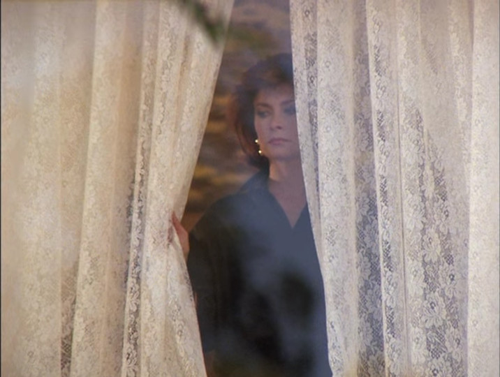 At this awkward juncture Alice excuses herself as having a ton of people to meet, then remembers that she hasn’t given Richard his gift yet and tells him to wait in the study while she goes to get it. It turns out that she left it in her car in the garage. When she gets there an engine is running. She leaves the door slightly ajar and goes to investigate, but the car’s doors are locked. Then the door she left ajar is slowly and quietly closed. She bangs against the door, calling for help, as she coughs from the carbon monoxide. She eventually falls to the ground, unconscious and we fade to commercial.