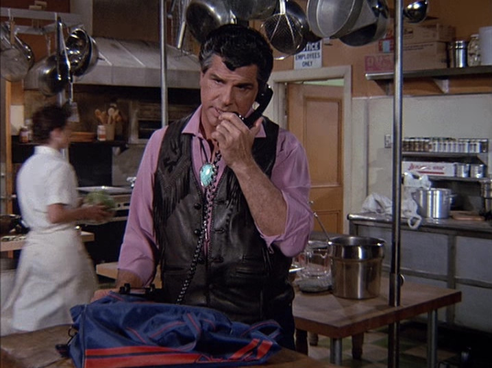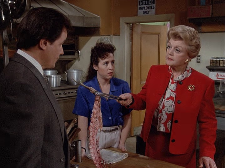 Alice and Doug were barely characters in the story, and the plot twist where Mimi spent the night of the murder with Doug was, perhaps, the least believable part of the episode. I think that they just cast about to find some man who was actually a character and since Harry was unavailable because he had to be at the scene of the crime to drop his pocket knife, the only other option was Lt. Rupp, and that would have been even less believable. I suppose that there was also Valentino, except they needed his alibi to be unable to hold minestrone. Anyway, I don’t think that Mimi was ever a very plausible suspect. There wasn’t much of a reason for her to avoid publicity about investing in the restaurant—she wrote a gossip column, not a restaurant review column—so even by the standards of Murder, She Wrote she didn’t have much of a motive.