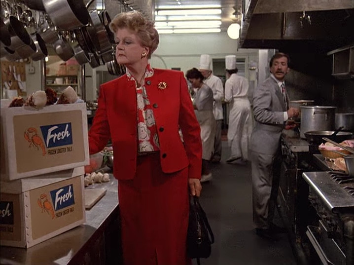 This leads Jessica to talk to Valentino, who, after all, is not an unreasonable guess for the purchaser. Chaz had a relationship with him, and he had no great love for Alice’s Farm Restaurant. Jessica’s pretext is that she is thinking of setting a novel in a restaurant and wants to do research. Of course, Jessica discovers the boxes of lobster left out on the counter.