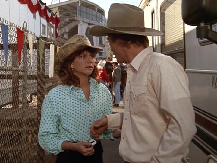 Her name is… actually, we don’t learn her name. Based on the credits, it might be Mona. Anyway, she’s his wife. She stays home during the rodeo season because they have a little ranch back home, and Buster is too young for all of the traveling. She’s just so gosh-darn lucky to be married to Marty, who is the greatest. She’s so naive it’s cute, if completely implausible. She’s from a small town in Montana. If small town folk are known for anything, it’s for suspecting sexual interaction when attractive women are hanging around attractive men without supervision. I mean, have the people who wrote Murder, She Wrote never listened to country music? (An example that leaps to mind is Dolly Parton’s song Jolene, in which she begs a prettier woman to not steal her husband. It came out in 1973.) In the 1980s, a hick from Montana might not suspect something new like cocaine use or recently popular sexual perversions. Infidelity is as old as the hills. Be that as it may, Marty comes over to get her and she says it was nice meeting some of his friends—it’s the first time she’s ever met any of them.