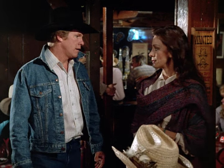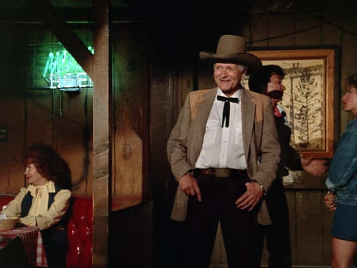 At the restaurant there’s music and dancing. A rodeo clown named Wally introduces himself to Jessica by commiserating about not being able to go all night (she had begged off dancing again as the scene began, and he has a bum leg). Then we meet a new character: