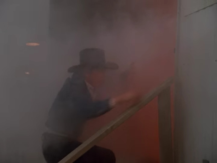That evening Boone is looking pensively at the bull when he notices smoke coming from the medical trailer. He runs over to it and it turns out to be very much on fire.