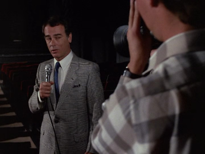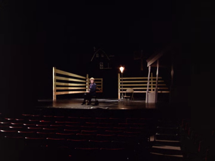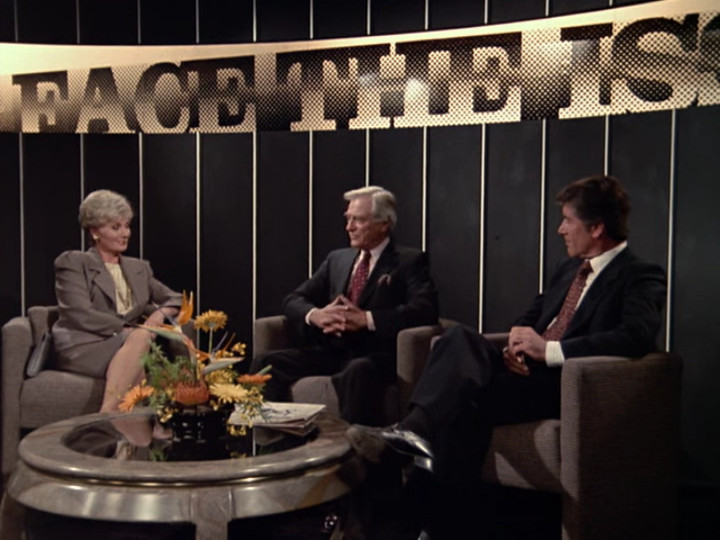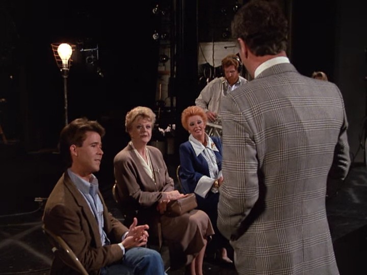It’s interesting how Murder, She Wrote has a visual language all its own. The next scene has Jessica sitting (apparently) alone, on stage. We hear a door close, which means that Jessica has invited the murderer to her impromptu accusing parlor.