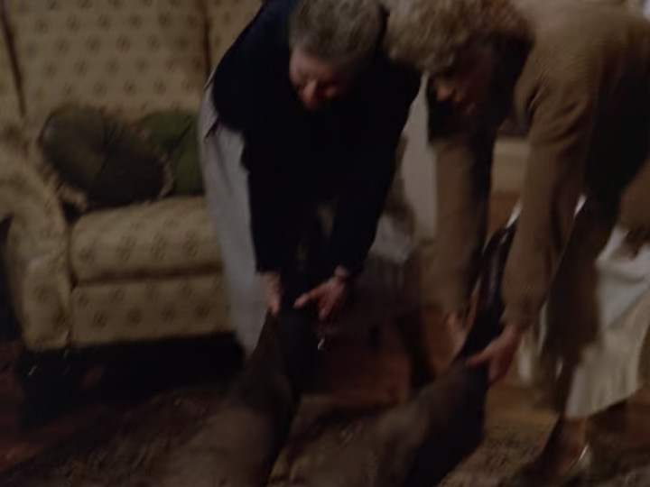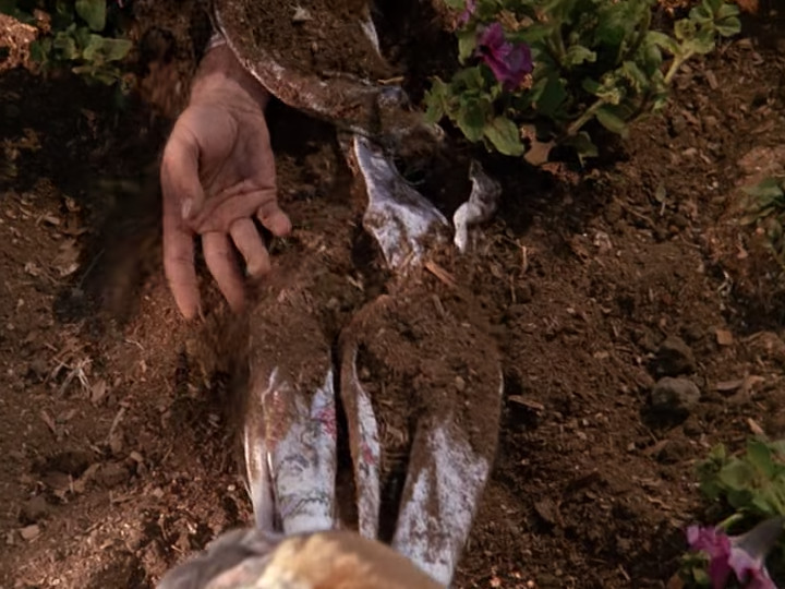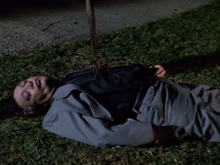 Back at the Appletree sisters’ house, Helen is digging another grave, this time for Cliff, who is lying dead on their lawn with a pitchfork stuck in his chest.