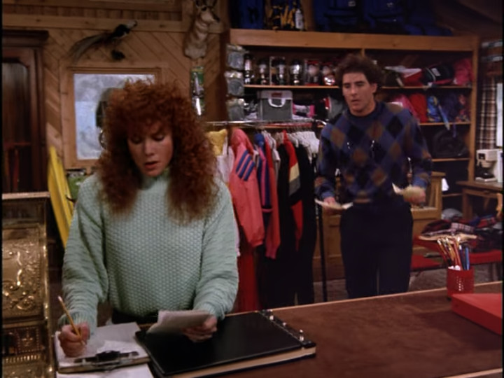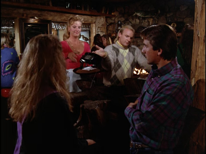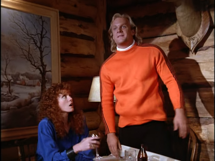 There is some banter, but it turns out that she represents a ski product company which has an endorsement deal with Gunnar that she negotiated, and she remonstrates with him because she’s heard rumors that he won’t compete in the world cup. He explains that he’s won plenty of things before now and is pushing thirty years old and could end up crippled like Mike and have to spend the rest of his years running a ski resort like Mike. (Interestingly, the actor, Eric Allan Cramer, was 26 at the time the episode aired, making this a rare case of playing older. Fun fact: five years later Cramer would play Little John in the Mel Brooks movie Robin Hood: Men In Tights)