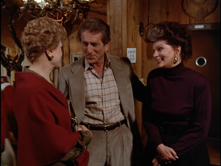 They joke a bit about Jessica being out of practice. (Johnny said she skied rather well, and, indeed, the stunt double we watched ski down the slopes did look to be in good practice.) It then comes up that there’s a big snowstorm expected the next day which will prevent all skiing, which Jessica takes relief at as she expects to pay for her heightened activity today. It’s a decent working-in of the upcoming plot point of the storm, but I’m not sure it’s really necessary. Storms, as acts of God, do not require foreshadowing in a mystery story.