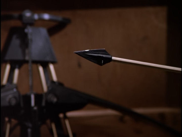Then scene then changes to a storage room where ominous music plays as gloved hands uncover the crossbow and pick up an arrow, showing it off to the camera.