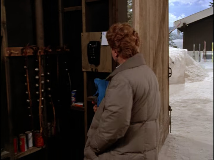 She checks the ski shop but it’s locked. As she does Ed pops out from behind the building with his gun pointed at her and tells her to freeze. After she identifies herself he explains that some guy with a muffled voice called him and said to meet him outside the ski shop because he had information about the case. It sounded like a trap to him so he hid himself and waited.