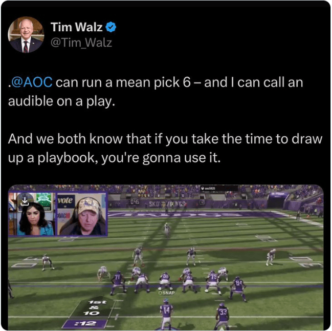 As in Astonishing Incompetence, I’ve waited until now to talk about this so that my post can be about the incompetence and not the politics: Tim Walz, when he was a Vice Presidential candidate, played a game of Madden Football with Alexandra Ocasio Cortez which was streamed on the streaming service Twitch. Afterwards, Tim Walz put out a hastily-deleted tweet: