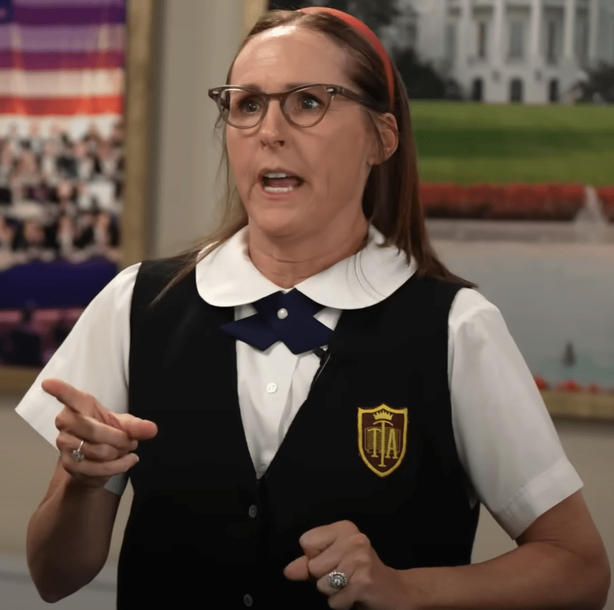 They’re ready? “They” haven’t been ready the whole time? I guess the writers forgot that the skit started with Kamala beginning her address and being interrupted by Mary Katherine. And are we really to suppose that someone only just noticed that Mary Katherine was here? Why would Kamala want to pretend that she’s surrounded by incompetents?