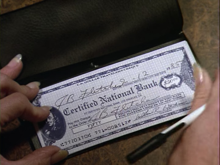 The purser looks it up in her filing cabinet and it turns out that it was an unsigned note with cash enclosed. (Enclosing cash was far more common in the 1980s than it is now; it’s not odd that the purser didn’t think that suspicious.) They give us a closeup of the note: