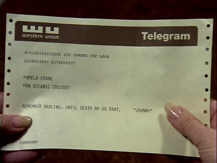So, overall, I think the plot held together quite well except for the part where George knew that Pam was going on this cruise at the last minute. And unfortunately the entire plot depended on that. They did, at least, bury this plot hole pretty well. About the only way to have made this work that I can think of would have been to have George have taken steps to forge some kind of connection or acquaintance with Johnny and Pamela Crane, which would entail the setup having been longer. That would provide a way for them to have been notified, though it possibly could have made them more direct suspects and reduced the degree to which “it was somebody who booked after us.” On the other hand, that was only ever the assumption because they had nothing else to go on, and it could have been worked such that they still assumed that.
