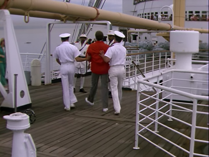 When we come back from commercial Jessica tries to talk the Captain into detaining George Reed, which the Captain flatly refuses to do simply upon Jessica’s say-so. I’m really not sure why Jessica was asking for George Reed to be detained, since it was hardly likely that he would jump overboard and escape by swimming, especially when he didn’t think that anyone suspected him.