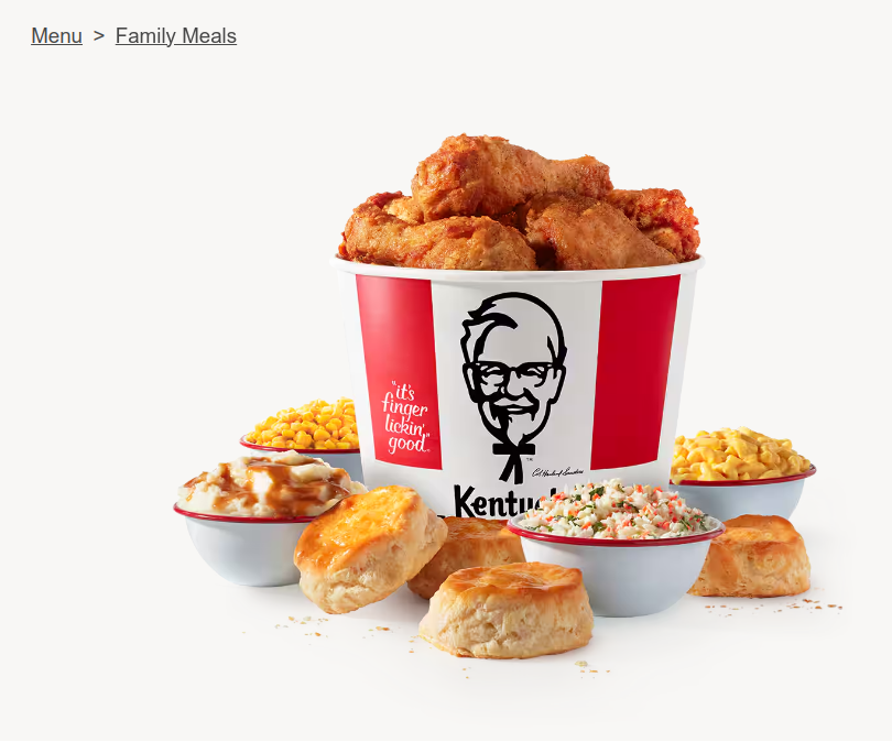 If you go to any KFC (formerly, Kentucky Fried Chicken), you will notice the image of Colonel Sanders. Take this example from their website of a family meal: